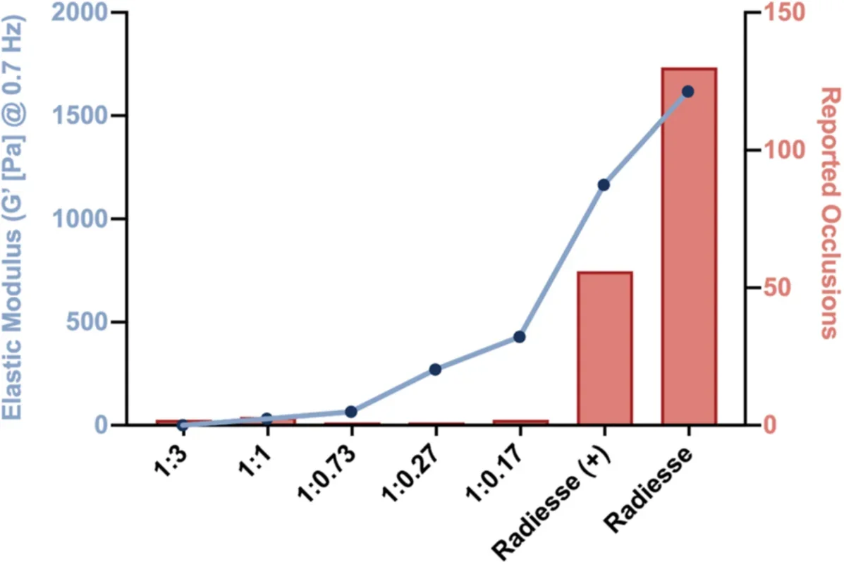 In filler procedures for nasolabial folds, vascular occlusion is a known risk. However, studies on Radiesse dilution suggest that even slight dilution reduces its elastic modulus, significantly lowering the likelihood of vascular blockage.
